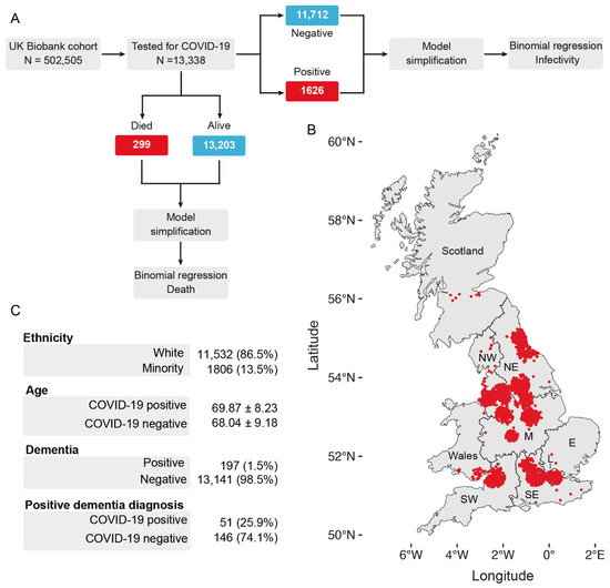 The following are available online at https://www.mdpi.com/2308-3417/6/1/10/s1, Table S1: Descriptive statistics of the UK Biobank cohort data. This table is related to Figure 1. Baseline characteristics of 13,338 UK Biobank participants included in the study. The C-reactive protein levels were normalised to total protein levels and log-transformed. White matter hyperintensity levels were normalised to total brain volumes and log-transformed. The household number refers to the number of people per household. N-Miss, number of missing values; SD, standard deviation; A-levels/AS levels, participants with Advanced Level (A-level) or Advanced Subsidiary Level (AS level) qualifications. NVQ/HND/HNC, participants who received vocational qualifications such as National Vocational Qualifications (NVQ), Higher National Certificate (HNC) or Higher National Diploma (HND); CSEs, participants with a Certificate of Secondary Education (CSEs); O-levels/GCSEs, participants with either a General Certificate of Secondary Education (GCSE) or a General Certificate of Education (GCE) Ordinary Level (O-levels), a secondary school leaving qualification. Table S2: Descriptive statistics for minority groups in the UK Biobank. This table is related to Figure 1. Summary of the number of individuals from each ethnic group included in the analysis and the outcomes of the COVID-19 test. The data are presented as the number of patients, followed by the percentage of the number of participants relative to the total number of participants in parentheses. N-Miss, number of missing values. Table S3: The diagnosis of dementia increases the risk of COVID-19. This table is related to Figure 2A. Risk factors associated with COVID-19 diagnosis in the UK Biobank cohort. The household number refers to the number of people per household. The odds ratios for education levels are relative to A-levels. NVQ/HND/HNC, participants who received vocational qualifications such as National Vocational Qualifications (NVQ), Higher National Certificate (HNC) or Higher National Diploma (HND); CSEs, participants with a Certificate of Secondary Education (CSEs); O-levels/GCSEs, participants with either a General Certificate of Secondary Education (GCSE) or a General Certificate of Education (GCE) Ordinary Level (O-levels), a secondary school leaving qualification. Table S4: The diagnosis of dementia increases the risk of COVID-19 death. This table is related to Figure 2B. Risk factors associated with both testing positive and dying from COVID-19 within the UK Biobank cohort. Blood pressure is relative to participants who were not tested for blood pressure. Smoking is relative to being a current smoker. The C-reactive protein levels were normalised to total protein levels and log-transformed. The household number refers to the number of people per household. Table S5: Diagnoses of Alzheimer’s and Parkinson’s diseases increase the risk of COVID-19. This table is related to Figure 3A. Risk factors associated with COVID-19 diagnosis in the UK Biobank cohort. The household number refers to the number of people per household. The odds ratios for education levels are relative to A-levels. NVQ/HND/HNC, participants who received vocational qualifications such as National Vocational Qualifications (NVQ), Higher National Certificate (HNC) or Higher National Diploma (HND); CSEs, participants with a Certificate of Secondary Education (CSEs); O-levels/GCSEs, participants with either a General Certificate of Secondary Education (GCSE) or a General Certificate of Education (GCE) Ordinary Level (O-levels), a secondary school leaving qualification. Table S6: Diagnoses of Alzheimer’s disease and parkinsonism increase the risk of COVID-19. Risk factors associated with COVID-19 diagnosis in the UK Biobank cohort. The household number refers to the number of people per household. The odds ratios for education levels are relative to A-levels. NVQ/HND/HNC, participants who received vocational qualifications such as National Vocational Qualifications (NVQ), Higher National Certificate (HNC) or Higher National Diploma (HND); CSEs, participants with a Certificate of Secondary Education (CSEs); O-levels/GCSEs, participants with either a General Certificate of Secondary Education (GCSE) or a General Certificate of Education (GCE) Ordinary Level (O-levels), a secondary school leaving qualification. Table S7: The diagnosis of Alzheimer’s disease increases the risk of COVID-19 death. This table is related to Figure 3B. Risk factors associated with both testing positive for and dying from COVID-19 within the UK Biobank cohort. The C-reactive protein levels were normalised to total protein levels and log-transformed. Table S8: Participants with Alzheimer’s disease have an increased risk of dying from COVID-19, independent of other common risk factors. Risk factors associated with both testing positive for and dying from COVID-19 within the UK Biobank cohort in the subset of patients with a positive diagnosis of Alzheimer’s disease. The model shows that a diagnosis of Alzheimer’s disease increased the risk of COVID-19 death, independent of underlying risk factors characterising the Alzheimer’s disease patients within the UK Biobank. Table S9: The diagnosis of Parkinson’s disease does not explain the risk of COVID-19 death. Risk factors associated with dying from COVID-19 within the UK Biobank cohort in the subset of patients with a positive diagnosis of Parkinson’s disease. The model shows that a diagnosis of Parkinson’s disease did not explain the risk of COVID-19 death, indicating that other comorbidities in participants with PD may explain their risk of dying from COVID-19. Table S10: Effect of drug treatment on COVID-19 mortality in the UK Biobank. Effect of drug treatments on COVID-19 mortality in the UK Biobank cohort. For each drug treatment (Drug treatment), the number of patients (Number of participants) taking the drug (TRUE) and not taking the dru