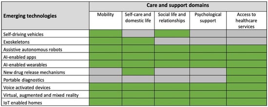 A summary of the emerging technologies and care and support domains that were assessed. The green colour indicates that the domain has been assessed, whereas the grey color indicates that it has not been assessed.