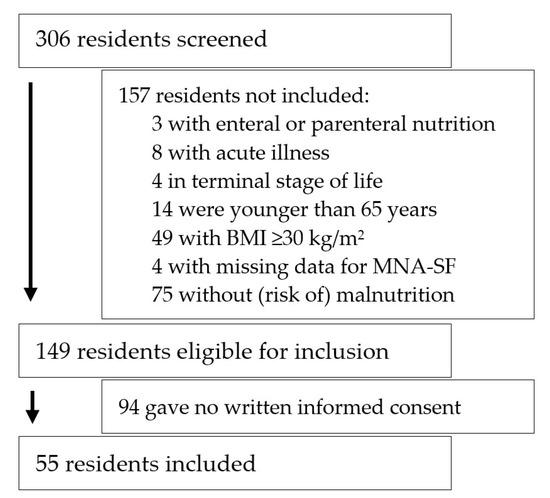 Of the 306 screened residents, 149 were eligible and asked for written informed consent. The intervention concept was applied to 55 residents (Figure 1).