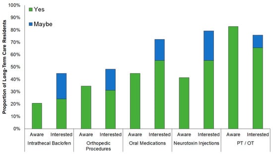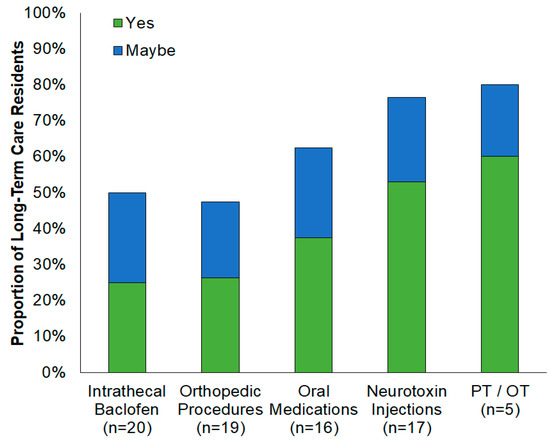 Impact of patient education on interest in spasticity treatments. Proportions of residents previously unaware of spasticity treatments (n) who subsequently indicated interest (Yes) or potential interest (Maybe) in receiving treatments after learning about them. Responses not shown to questions regarding interest—“No”: intrathecal baclofen (50%); orthopedic procedures (53%); oral medications (25%); neurotoxin injections (18%); PT/OT (20%); “Unsure”: oral medications (13%); and neurotoxin injections (6%).