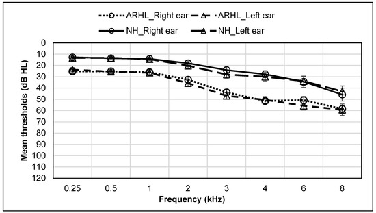 Audiogram for ARHL and NH groups. Average of air conduction hearing thresholds for both ears across frequencies in ARHL and NH groups. Error bars represent standard errors.