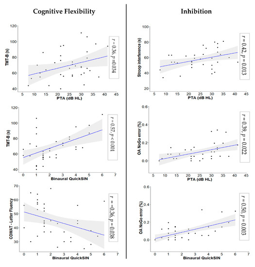Several significant associations between hearing measures and measures of cognitive flexibility and inhibition were observed. With regard to our primary analyses related to cognitive flexibility, we found a significant positive correlation between PTA and completion time on the TMT-B, r(32) = 0.36, p = 0.034. When partial correlations between binaural QuickSIN score and measures of cognitive flexibility were examined controlling for PTA, a significant positive correlation between binaural QuickSIN score and TMT-B, r(31) = 0.57, p < 0.001, and a significant negative correlation between binaural QuickSIN score and Letter Fluency score, r(31) = −0.36, p = 0.038, were observed. Our secondary analyses found no significant correlations between measures of low- and high-frequency hearing and cognitive flexibility.