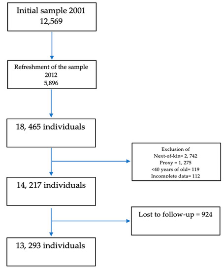 In order to take advantage of the Mexican Health and Aging Study design, all participants in the 2012 wave were included in this study; survivors of the baseline wave in 2012 and the cohort sample refreshment (n = 18,465). Information for 2742 and 1275 participants were collected through next-of-kin (spouse, child, person familiar to the surroundings of the deceased in the las months) interviews and proxy interviews, respectively (http://mhasweb.org/StudyDescription.aspx (accessed on 7 March 2021)). These participants as well as those younger than the age of 40 (N = 119) or with incomplete data (n = 112) were excluded. The final sample included in this study was 14,217. Among them, 924 individuals were lost to follow-up; therefore, 13,293 adults comprised the sample for the survival and disability analysis. (Figure 1)