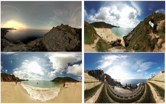 The 360° video was a series of 5 × 30 second clips fading into one another, designed to feel like a day’s journey through a recognisable local spot, starting in the morning and ending with a sunset. The videos showed pre-recorded scenes of local Cornish beaches and coastal areas with audio of natural sounds such as gently breaking waves. In addition, one video depicted people engaged in activities on a beach with sounds of laughter and chatter. Another clip was taken underwater on a reef that was not local but was of high quality and included footage of gently shoaling fish. Example stills from the clips are shown in Figure 1. There was ‘surround sound’ rather than headphones to enable the carer to hear and converse with the person with memory loss where needed.