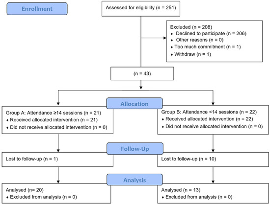 A quasi-experimental study comparing two groups determined through number of attendances to the virtual exercise sessions was conducted (Figure 2). All participants were invited to take part in a four-week course of daily virtual group exercises. Participants with virtual group exercises attendance of 14 or more were included in Group A while those attended fewer than 14 sessions were included in Group B. The cut-off of 14 session was determined using the median attendance level. Exercise adherence was recorded using a daily exercise diary. Both the booklet and virtual exercises focused on muscle strengthening by gradually increasing repetitions, coordination and fine motor training. The study protocol had been registered with the National Malaysian Research Registry (NMRR-20-1629-55960). The four-week virtual exercise was tailor-designed for older persons by the authors and a physiotherapist. Recruited participants were invited to take part in a 30-min daily virtual exercise class. The installing instructions of Google Meet were sent via text and video demonstration. A 2-h trial run or rehearsal session was set up two days before the actual start of the program. The researcher continued to provide technical support from the time of the trial run up to the start of the program and throughout all exercise sessions through the social media messaging group set up for this purpose.