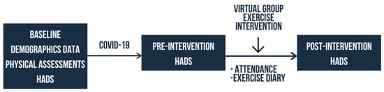 While these measures were effective in controlling viral transmission, they are expected to have a negative impact on the psychosocial health of the community [3,4,5]. Psychological distress was reported between 12 and 52 percent in older adults during this pandemic [6,7]. The heightened risk of severe COVID-19 illness for older persons further increased fear among older people. Therefore, community-dwelling older people living in urban areas stayed at home and became socially isolated as a result of both pandemic response measures as well as anxiety-induced self-imposed isolation. As a result of the mandatory self-isolation, physical activity appears to decline, affecting subjective well-being [8,9]. A large body of evidence supports the benefit of regular physical activities in reducing health risks [10]. We, therefore, conducted a feasibility study to evaluate recruitment, data collection and group exercise intervention delivered through virtual technology among individuals aged 60 years and over in Malaysia, an upper middle-income developing nation in South-East Asia. This feasibility study describes the process of executing the study and to inform the development of the protocol for larger randomized-controlled-trial [11]. This study will therefore provide insights into introducing the use of technology for social activities in the form of group exercise among older adults, a practice previously unfamiliar to them and health care professionals.