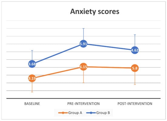 A complete case mixed between-within subjects analysis of variance showed no difference between groups and across time in anxiety scores (Wilks’ Lambda = 0.96, F (2, 30) = 0.61, p = 0.55, partial eta squared = 0.04), and depression scores (Wilks’ Lambda = 0.89, F (2, 30) = 1.80, p = 0.18, partial eta squared = 0.11). With multiple imputation on post-intervention anxiety scores, there was a substantial main effect for time (p < 0.005) suggesting a significant increase in anxiety scores across time between baseline, pre- and post-intervention. Post-hoc test (Bonferroni) showed significant increase in anxiety scores between baseline anxiety scores and both pre- and post-intervention. There was no significant difference between before and after intervention in anxiety scores (Supplementary Table S1).