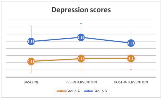Depression scores were not significantly different across time or between groups for both original and imputed data analysis. Changes in anxiety and depression scores over time for all participants and the two intervention groups are also summarized in Figure 3 and Figure 4.