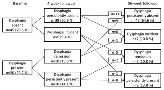 At 4-week-follow-up, signs of dysphagia were persistently absent in 39 patients (61%), remitted in 10 patients (15%), were incident in 6 patients (9%), and were persistently present in 10 patients (15%). At 56-week follow-up, signs of dysphagia were persistently absent in 42 patients (64%), remitted in 7 patients (11%), were incident in 7 patients (11%) and were persistently present in 9 patients (14%). There were no significant differences in the dysphagia severity level (χ2 (2) = 129, p = 0.524) across the three time points.