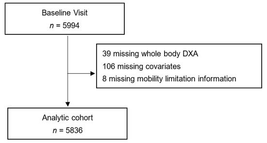 We adjusted models for covariates that we a priori considered important potential confounders (but not mediators) of the body size or composition relation with mortality or mobility limitation. These included age, clinical center, race, height (for percent fat and weight models), total energy intake, smoking status and the number of comorbidities. All significance levels were 2-sided. Analyses were conducted using SAS version 9.4 (SAS Institute, Inc., Cary, NC, USA). MrOS data from February 2019 were used (Data can be accessed here: https://mrosonline.ucsf.edu (accessed on 15 January 2020)).