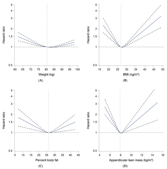 Over 10 years, 1630 (27.9%) of men died. In multivariate models, men with the lowest (Q1) and highest (Q5) weight were somewhat more likely to die during follow-up than men in the middle quintile of weight (Q3). Spline plots confirmed this U-shaped relationship (Figure 3A). Similar associations were seen for percent fat and mortality (Table 2 and Figure 3C), and the U-shaped relation with mortality was even more pronounced for BMI-mortality and ALM-mortality associations (Table 2 and Figure 3B,D).