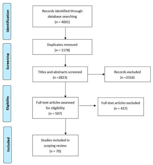 Once duplicates were removed, two independent reviewers screened the titles, keywords, and abstracts of each 2823 records to determine if they met our inclusion criteria. After an independent review, they came together to confirm results; when there was disagreement, they reviewed the abstract together to reach consensus. After excluding 2316 articles, two independent reviewers assessed the full text of 507 papers to assess their eligibility for inclusion. At this stage, we also narrowed our focus to ensure that relevant articles met all three of our criteria simultaneously. This meant excluding articles that were not explicit about their sample. For example, in some articles, data were collected from heterosexual and sexual minority participants; each article was also reviewed to ensure that in addition to including data on LGBTQ+ individuals, they also needed to be over 65 and Canadian. After review, our final sample included 70 articles that met our inclusion criteria as summarized in Figure 1.