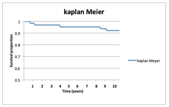 The survival rate of these patients over 65 years at 10 years was 92.2% (95% CI (89.1%, 96.1%)) and the Kaplan–Meier curve is shown in Figure 1. The 26 prostheses performed using the current technique showed a greater survival than the average of the series, being 94.1% (95% CI (89.7%, 97.2%)), although this was not statistically significant.