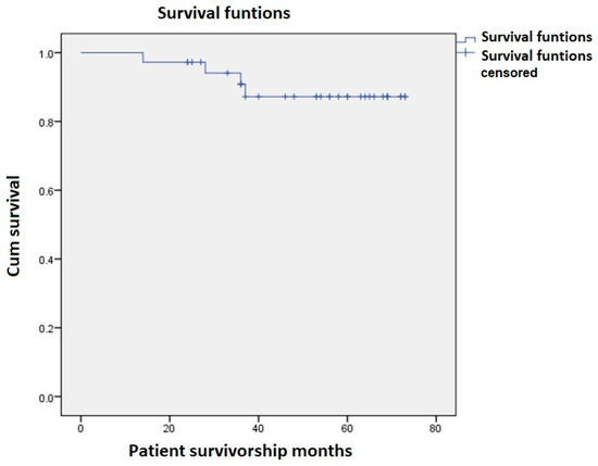 Four patients (11.1%) died up to 1 March 2021. Causes of deaths were acute congestive heart failure 3 years after replacement, pneumonia 37 months after surgery, B-cell lymphoma 28 months postoperatively, and a patient diagnosed with a bladder carcinoma 2 years before the operation who died 14 months after operation, due to acute kidney failure due to the urological tumor. The estimated mean patient survivorship was 67.4 months (SD ± 2.627 months). The Kaplan–Meier analysis of patient survivorship is shown in Figure 1.