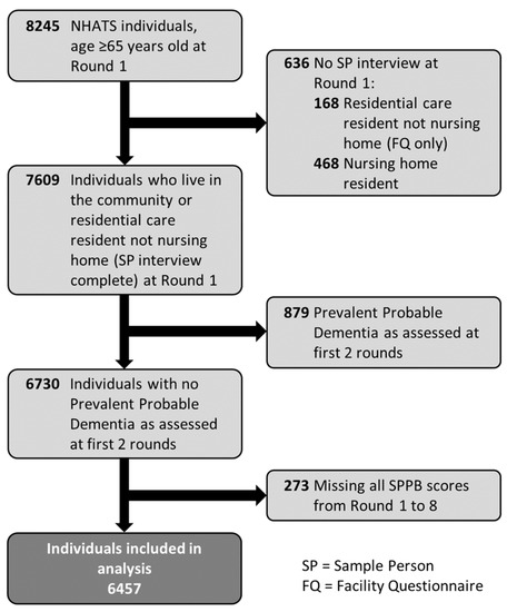 A total of 8245 individuals aged 65 and older were enrolled in NHATS at Round 1 (2011), with follow-up data collection occurring annually thereafter. At Round 1, subjects living in residential care facilities (n = 168) and nursing homes (n = 468) where physical and cognitive assessments could not be performed were excluded from analysis. Of the 7609 individuals living in the community or residential care residents able to complete the physical and cognitive assessments, 879 were excluded due to presenting with probable dementia at Rounds 1 and 2. An additional 273 participants missing all SPPB scores from Round 1 through Round 8 were removed from the remaining group of 6730 individuals with possible dementia or no dementia at baseline. The final study population consisted of 6457 individuals (Figure 1).