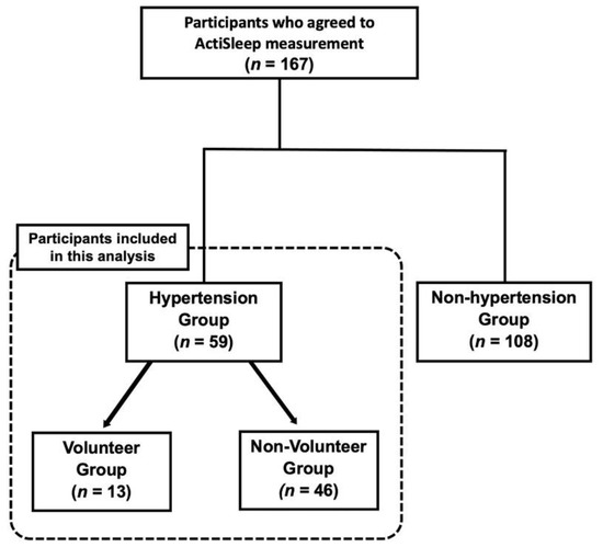 None of the 167 recruited participants withdrew their consent for participation during the survey or measurements (participation rate 100%). Of those 167 participants, 59 self-reported that they were being treated for hypertension. Data regarding basic demographics, daily activities, lifestyle, sleep status, and health status of the 59 participants with hypertension are shown in Table 1 and Table 2.