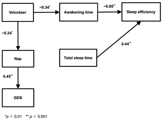 As for overall effect, the path coefficient from “volunteer” to “sleep efficiency” via “awakening time” was 0.29 (volunteers did show higher sleep efficiency) while the path coefficient from “volunteers” to “GDS” via “nap” was −0.15, indicating a possible explanation for the lower GDS scores in volunteers. Thus, our model (Figure 2) was adopted for its high compatibility and explanatory power. The model intimates that older adults with hypertension who participate in volunteer activities have higher sleep efficiency and lower levels of depression.