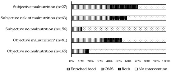 Seventy-three (29.7%) residents received NIs, 68.5% of them enriched meals, 4.1% ONS, and 27.4% both. Figure 1 presents the provision of NIs stratified by subjective and objective MN. A total of 70.4% of those who were judged by the nurses to be malnourished and 53.0% of residents who were malnourished based on the objective criteria received NIs. A total of 10.9% of subjectively and 18.2% of objectively well-nourished residents received NIs.