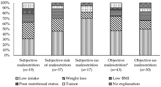 Reasons for nutritional interventions (%) stratified by subjective judgement of malnutrition by nursing staff and objective rating of malnutrition (* BMI < 20 kg/m2 or weight loss ≥ 5% in last 3 months or intake ≤ 1/4 of the meal).