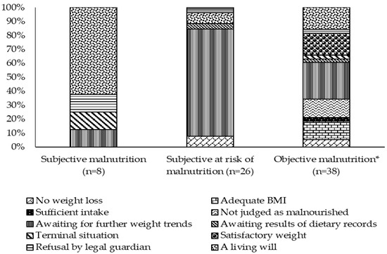 Reasons against nutritional interventions (%) despite (risk of) malnutrition according to subjective rating of malnutrition by nursing staff and objective rating of malnutrition (* BMI < 20 kg/m2 or weight loss ≥ 5% in last 3 months or intake ≤ 1/4 of the meal).