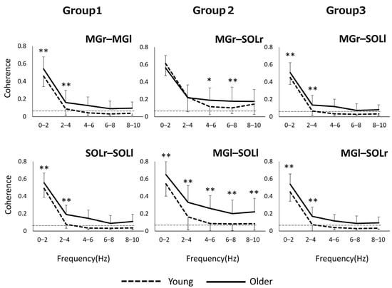 Figure 1. In Groups 1 and 3, the older group showed significantly higher values than the younger adults in the frequency band of 0–4 Hz (Figure 1). In Group 2, the older group had higher values than the younger one in all frequency bands within 10 Hz for the left limb muscle pair and in the 4–8 Hz frequency band for the right limb muscle pair. * p < 0.05, ** p < 0.01.
