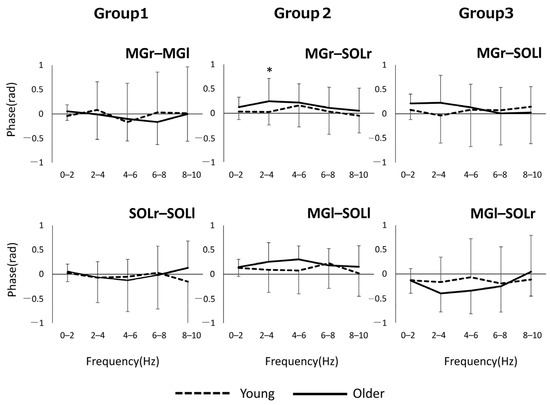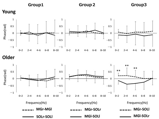 Figure 2 shows the phase–frequency plot of the muscle pairs due to the aging effect. The phase–frequency plot is almost flat around 0 rad for most of the muscle pairs in both Group 1 and Group 3, but there is a significant difference between the two groups for MGr–SOLr in Group 2 (p = 0.04) (Figure 2). Figure 3 shows the results of the phase difference between the muscle pairs (Group 1–Group 3) and a comparison within groups. The within-group phase–frequency plots show that both muscle pairs are close to 0 rad in the younger group (Figure 3). On the other hand, there is a phase difference between MGr–SOLl and MGl–SOLr in the older adults in the frequency ranges of 0–2 Hz (p = 0.001), 2–4 Hz (p < 0.001), and 4–6 Hz (p < 0.001) (Figure 3).