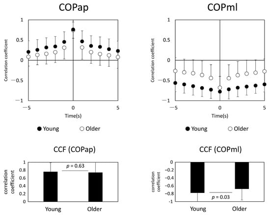 Figure 4. Center of pressure cross-correlation function (CCF) analysis (left panel: younger age group, right panel: older age group). The upper panel shows the plot of CCF, and the lower panel shows the results of the t-test between the two groups. Abbreviations: COPap, center of pressure in the anterior–posterior direction; COPml, center of pressure in the medial–lateral direction.