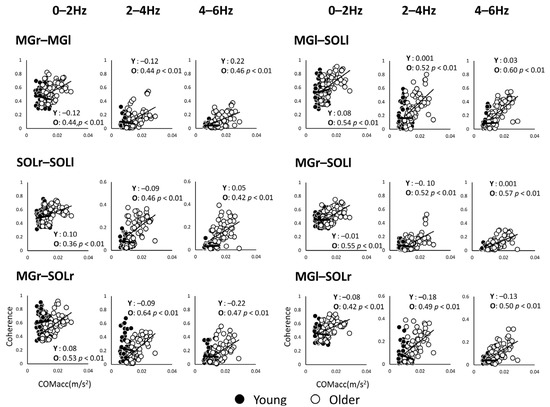Figure 5. Correlation analysis between coherence values of muscle pairs and acceleration of the center of mass in the anterior–posterior direction for each of the two groups, plotted for each frequency band. The open black circles represent the younger adults (Y) and the solid circles represent the older adults (O). Abbreviations: MG, medial gastrocnemius; SOL, soleus; r and l, respectively, right limb and left limb.