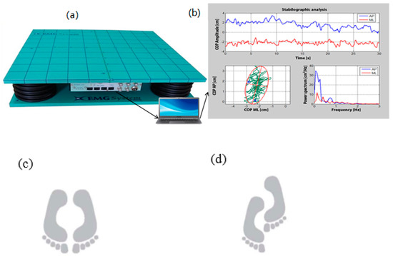 Force plateform and COP measurement. Instrument for measuring with a force platform (BIOMEC400, EMG System do Brasil, Ltda.) (a); and postural control measurements based Pressure Center parameter: COP (elliptical area of the COP, frequency and velocity in the anteroposterior and mediolateral directions (b). Postural control tasks with a standardized protocol in bipodal (c) and semi-tandem (d) postures using leg preference in front.