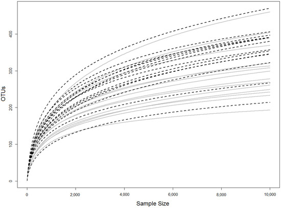Rarefaction curves of subgingival samples in the cognitive impairment group and cognitively normal group. The horizontal axis shows the number of sequenced DNA fragments. The vertical axis shows the number of operational taxonomic units (OTUs) at a 97% similarity level.