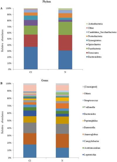 Relative abundance of subgingival microbiota composition at phylum level (A) and genus level (B) in cognitive impairment group (CI) and cognitively normal group (N).
