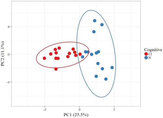 Principal component analysis (PCA) of subgingival microbiota in cognitive impairment group (red) and cognitively normal group (blue).