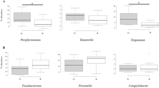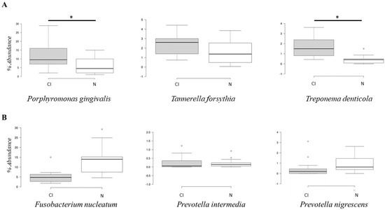 Box and whisker plot on percentage abundance of red complex (A) and orange complex (B) genera in cognitive impairment group (CI) and cognitively normal group (N). * Significant p < 0.05.