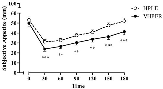Subjective appetite responses (mean ± SEM) for HPLE (dashed line, clear circles) and VHPER (solid line, black circles). ** p < 0.01; *** p < 0.001.