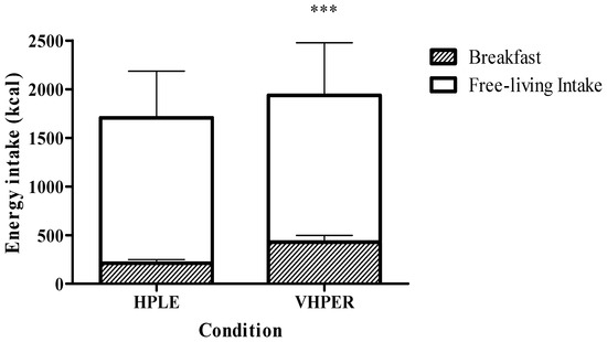 Twenty-four hour (total bar height), breakfast (shaded component of bar) and free-living (clear component of bar) EI (mean ± SEM) for HPLE and VHPER. *** p < 0.001.