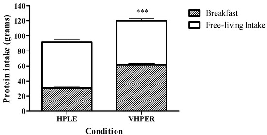 Twenty-four hour (total bar height), breakfast (shaded component of bar) and free-living (clear component of bar) protein intake (mean ± SEM) for HPLE and VHPER. *** p < 0.001.