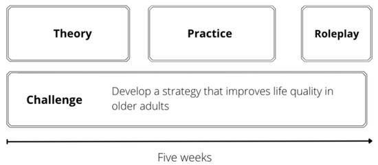 A pilot implementation strategy to battle ageism was created in the Healthy Environments and Self-care for the Older Adults module. This strategy was implemented in the School of Medicine and Health Sciences of Tecnologico de Monterrey, an institution that has adopted Challenge Based Learning as an educational model [27]. This five-week module is taken by third-semester students from health programs (psychology, medicine, nutrition, biosciences, and odontology). It includes two main parts: the challenge, and the theoretical and practical modules. At the end of the five-week period, students are enrolled in a role-play simulation. Figure 2 depicts a general outline of the five-week strategy.