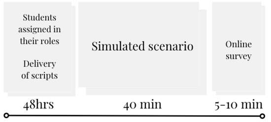 Leveraging the use of the videoconferencing tool to conduct the implementation, students were assigned to Breakout Rooms (BOR) for 40 min in three roles: health professional, patient, and observer. Scripts were given prior to the class and according to their role. The case in the simulated scenario was a primary care consultation with a retired older adult with insomnia and depressive symptoms, the complaints were exacerbated after retirement. Figure 3 depicts a visual overview of the simulated scenario activity including the delivery of the script and the online survey completed afterward.
