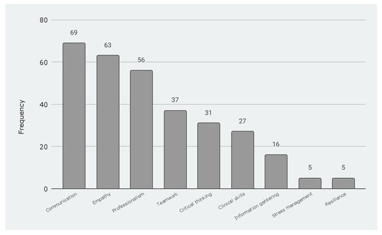 First, participants were asked to select up to three competencies that the educational strategy helped them develop the most. It is important to note that some participants highlighted one, others two, and other three competencies. From the options provided, the participants identified communication which received 69 mentions, empathy with a frequency of 63, and professionalism with 56 mentions as the most relevant. Results are presented in Figure 4.