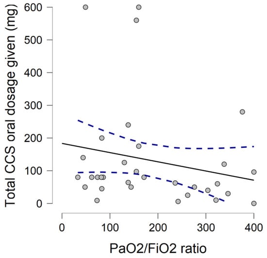 Correlation plot between PaO2/FiO2 ratio at nadir and total corticosteroid dosage received prior to hospital admission.