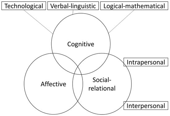 Adoption of technology is influenced by a person’s skill and proficiency in using technology [25]. Cartelli 2010 proposed a framework for the adoption of digital technology (Figure 1), in which the adoption of technology is underpinned by three interacting main domains, namely (i) Cognitive domain, whose constituent elements include knowledge, comprehension, application, analysis, synthesis, evaluation; (ii) the Social-relational domain underpinned by introspective, and self-reflective skills and capacities; and (iii) the Affective domain—receiving phenomena, responding to phenomena, evaluating, organising and internalising phenomena [26]. In particular, the cognitive and affective domains may provide insight into the slow uptake of technology by older adults, due to limited technological exposure and application, inexperience and subsequent lack of confidence. As well as diminishing capacities for receiving and responding to phenomena, older people may be reluctant to engage in the use of technology [27,28].