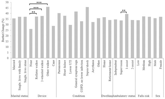 Figure 1 presents the differences in functional change based on predictor variables. Functional change was not significantly related to marital status, falls risk, dwelling, sex, age, or number of comorbidities. However, the condition of the patient affected functional change, F7, 522 = 2.28, p = 0.029, ηp2 = 0.051, but Tukey post hoc testing revealed no significant differences between groups. Ambulatory status also had a significant effect on functional change, F3, 524 = 4.33, p = 0.005, ηp2 = 0.024, with those who required a one-assist, having a higher functional change (M = 39.56, SD = 18.79) compared to those requiring supervision (M = 33.77, SD = 16.63, p = 0.003). There was also an effect of ambulatory device on functional change, F4, 525 = 7.37, p < 0.001, ηp2 = 0.053, with those who did not use a device having a lower change (M = 26.18, SD = 12.94) compared to those using a rollator walker (M = 37.18, SD = 17.48, p = 0.006), two-wheeled walker (M = 37.76, SD = 18.51, p < 0.001), or “other” walker (M = 46.07, SD = 17.46, p < 0.001).
