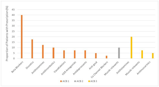 The most frequently prescribed medication class with ACB score 2 was skeletal muscle relaxant (10% of the sample), with 100% of those receiving cyclobenzaprine. Prescribed medications with ACB score 1 belonged to a diverse range of medication classes. The majority of patients with prescriptions for medications with ACB score 1 received beta-blockers (metoprolol) (40% of sample), followed by diuretics (furosemide) (18%), systemic antihistamines (cetirizine, loratadine, desloratadine) (13%), and antithrombotics (warfarin) (10%) (Figure 1 and Table 2).