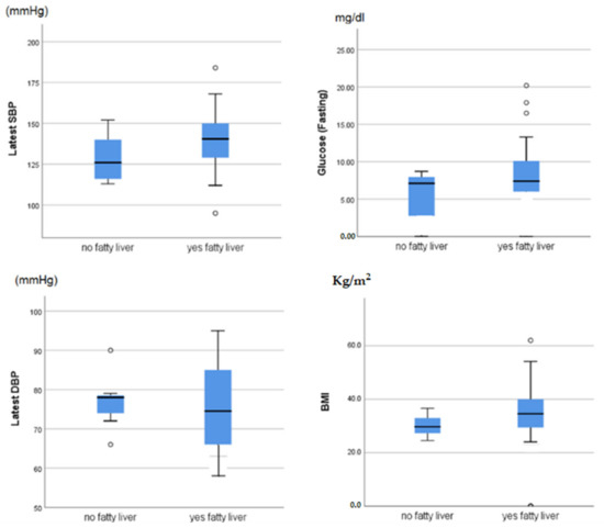 No statistically significant associations were recorded, although all metabolic parameters linked with metabolic syndrome were higher in people with fatty liver (apart for diastolic blood pressure).