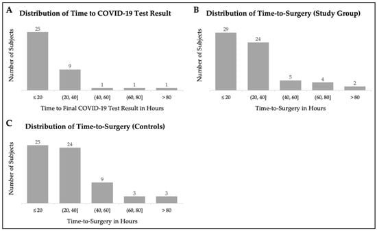 Distribution in time to COVID-19 test result (A) and time-to-surgery for study group (B) and control subjects (C).