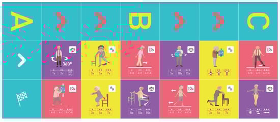 This is why our team developed, a few years ago, a giant physical activity board game, GAMotion, in order to promote physical activity in nursing homes. It is a medical device of class 1. As shown in Figure 1, the GAMotion measures 3.5m long and 1.5 m wide and is composed of 12 squares divided into three distinct colors corresponding to the three main components of physical activity: balance (four purple squares); muscle strength (four yellow squares); and walking or endurance (four red squares). In addition, the mat has seven squares which represent the walking path to perform the walking exercises (red squares). On each square, three levels of difficulty are represented by one, two, or three stars so that the exercises are suitable for the fitness levels of all participants. The principle of the game is similar to the traditional goose game, and the game only requires a die and a chair.