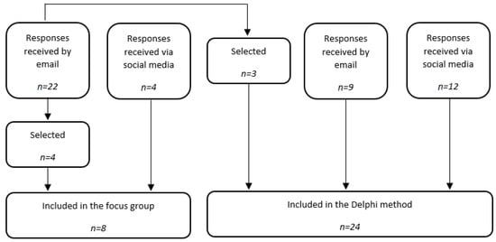 As shown in Figure 2, a total of 32 healthcare professionals took part in the study (i.e., eight in the focus group and 24 in the Delphi method).