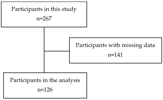 In this cross-sectional study, the participants were recruited from older people who were certified as needing support and nursing care under long-term care insurance and were using delivered homecare services and daycare services at home. Participants were individuals aged >65, living at home for at least 3 months, with preserved cognitive function, and could answer a self-rating questionnaire. Whether the participant had the cognitive function to respond to the self-rating questionnaire was determined by a physical therapist or occupational therapist who was fully aware of the participant’s cognitive status through daily care. Questionnaires were distributed to 267 individuals who consented to participation in this study. Of these individuals, 126 (47.2%) filled out all items in the questionnaires and were included in the analysis (Figure 1).