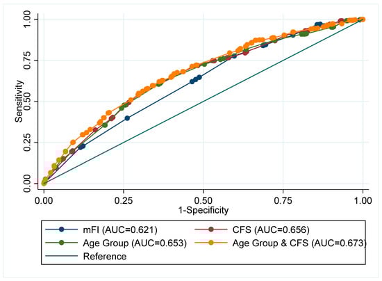 For prolonged admission, the AUROC was 0.56 (95%CI 0.52–0.60) for mFI, 0.66 (95%CI 0.62–0.70) for CFS, and 0.60 (95%CI: 0.56–0.63) for age (Supplementary Table S5). Comparing the AUROC, the CFS offered improved discrimination compared to age (p < 0.001) and age + mFI (p < 0.001), but mFI was not found to offer improved discrimination after accounting for CFS (p = 0.055).