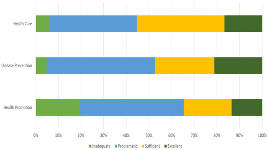 Dividing health literacy by health-relevant areas, indexes are different among those: for healthcare literacy and disease prevention, a 36-point mean score (‘Sufficient’) is higher than the average score for health promotion, which is 32 points (“Problematic”). These data are corroborated by the health literacy level’s distribution, where scores compatible with limited health literacy for health promotion are observed in more than 60% of the sample, as shown in Figure 2.
